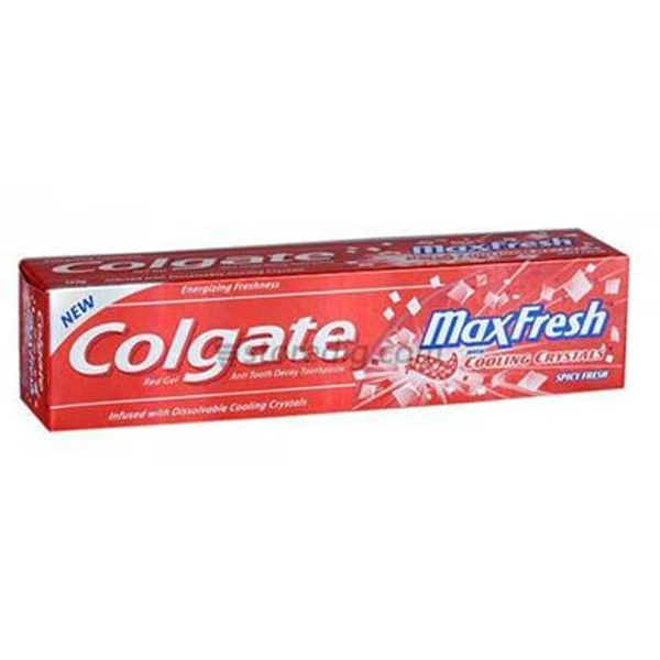 Colgate Maxfresh toothpaste contains menthol that gives intense cooling and super freshness. It fights cavities, keeps germ build-up at bay and makes your teeth whiter on continuous use. It is a red gel with cooling crystals that provide intense freshness.