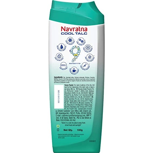 Navratna Cool Talc with icy cool formula gives you instant cooling relief. It is enriched with the goodness of ingredients like menthol which gives a long-lasting cooling effect. Its refreshing fragrance revitalizes your senses and gives you long-lasting freshness.