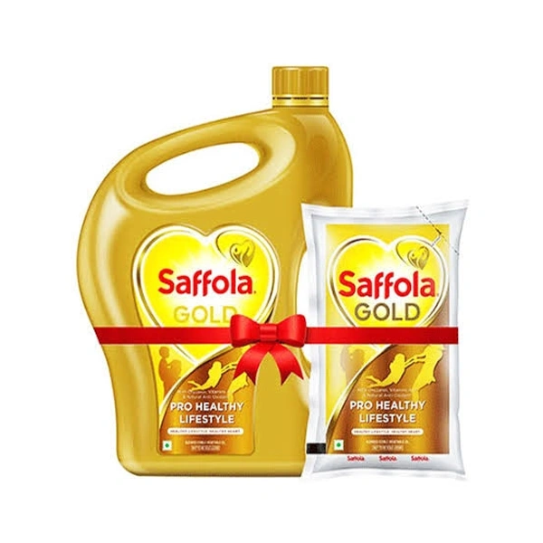 Saffola Gold is a blended edible cooking oil that is made up of 80% refined rice bran oil and 20% refined sunflower seed oil. Saffola Gold also contains natural antioxidants oryzanol, tocopherol and tocotrienol along with vitamins A and D. This cooking oil helps you stay healthy by taking care of your heart.