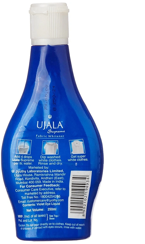 Ujala Supreme Fabric Whitener has ultra radiance molecules, that helps it to dissolve faster, penetrate deeper and act instantly to make your clothes dazzling white. With only 4 drops to a litre of water, you will get that whiteness seen never before with uniform and consistent results.